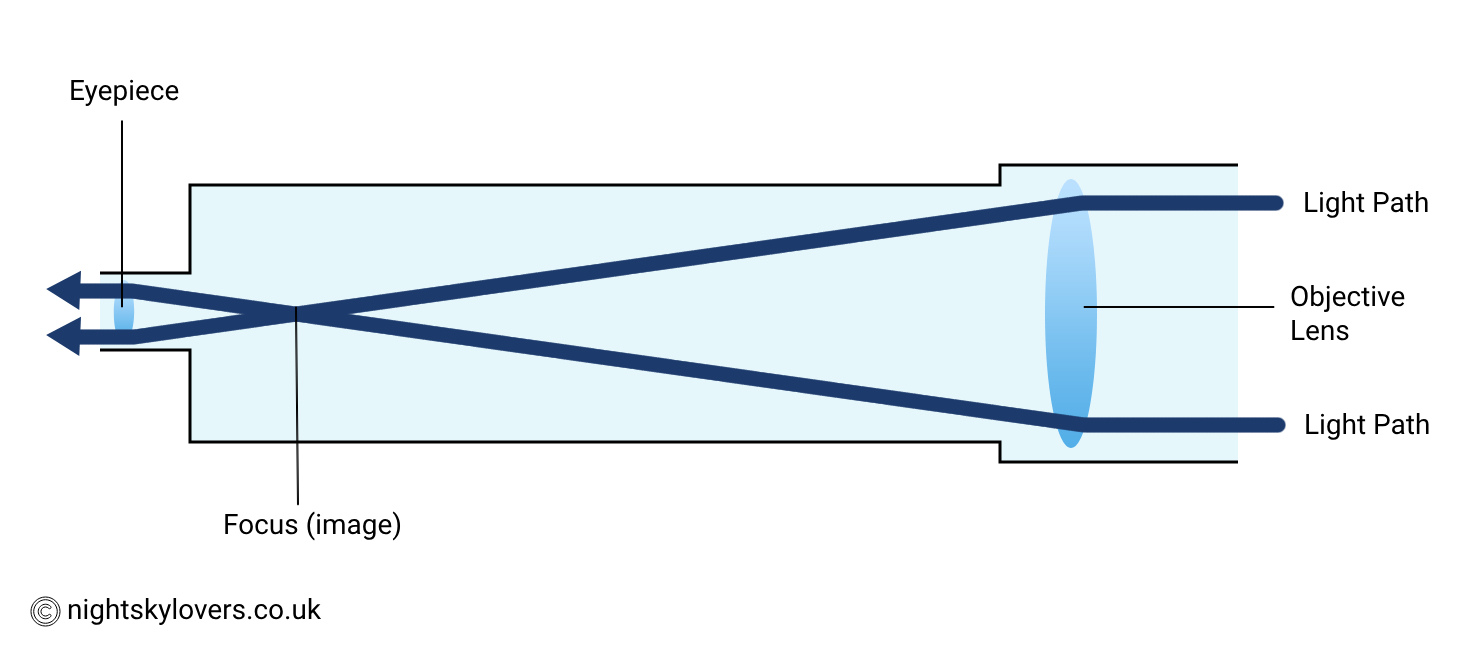 Refractor telescopes use lenses to bend (or refract) light to a focal point. They’re typically long and slender with the eyepiece at the back. This classic design is known for delivering crisp, high-contrast views, particularly of the Moon, planets, and double stars.